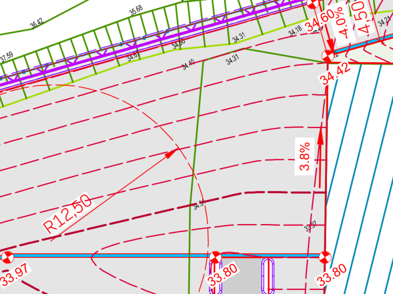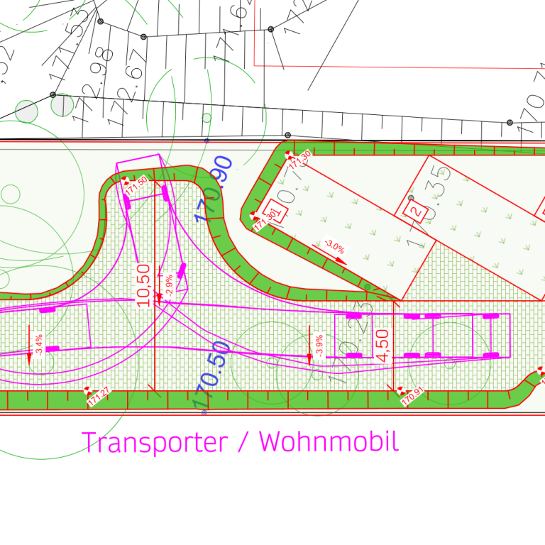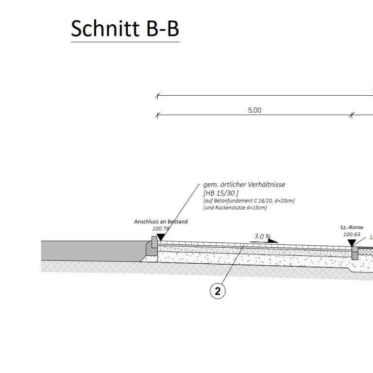 Die Höhenplanung ist das kritische Bindeglied zwischen Hochbau, Straßenbau und Entwässerung. Wir erstellen präzise digitale Geländemodelle (DGM), um ein ausgewogenes Erdmassenmanagement zu gewährleisten. Ein besonderes Augenmerk legen wir auf die Barrierefreiheit (gemäß DIN 18040) und die Sicherstellung des natürlichen Abflusses, um Oberflächenwasser gezielt in die vorgesehenen Entwässerungssysteme zu leiten und Gebäudeschäden zu vermeiden.