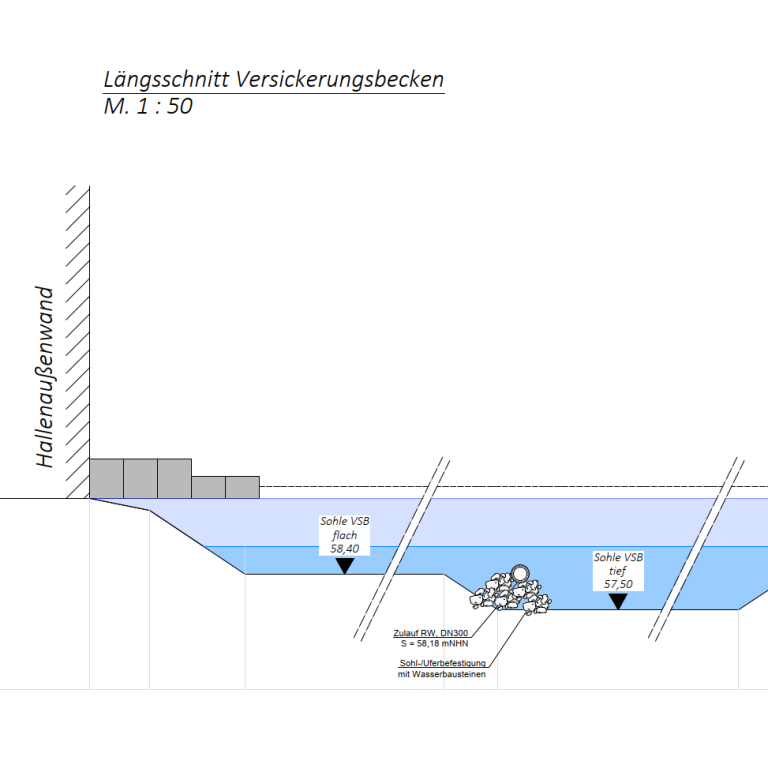 eines privaten Trennsystems zur Abwasserableitung von Schmutz- und Regenwasser, einschl. Abflussdrosselung und Regenrückhaltung in Stauraumkanal. Hinzu kommt die Abwasseraufbereitung in einem Koaleszenzabscheider.